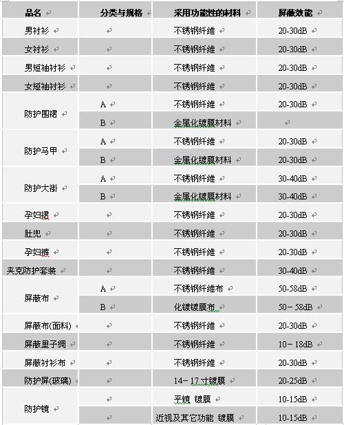 表3 常用电磁辐射个体防护产品